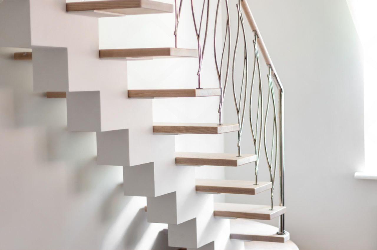 Основа композиции — белоснежный  бетонный монокосоур, который служит невидимой несущей осью и словно растворяется в пространстве. На нем, будто паря в воздухе, расположены ступени из натурального бука, которые привносят в интерьер тепло и природную текстуру. Особый шарм конструкции придает комбинированное ограждение: тактильно приятный деревянный поручень плавно переходит в лаконичные металлические основания, а тонкие фигурные стержни балясин с хромовым покрытием ловят блики света, добавляя динамики.